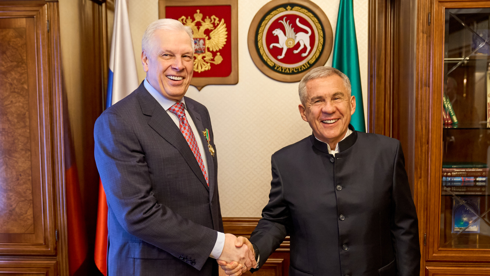 В Москве прошла встреча Раиса Татарстана Рустама Минниханова с руководителем Россельхознадзора Сергеем Данквертом, в которой участвовал вице-премьер Марат Зяббаров. Подписано соглашение о передаче части полномочий ветеринарного надзора, а Минниханов вручил Данкверту орден.